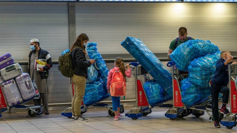 Travellers receive tests for the coronavirus disease COVID-19 at a pre-departure testing facility as countries react to the new coronavirus Omicron variant outside the international terminal. Authorities in Australia said Sunday Nov.